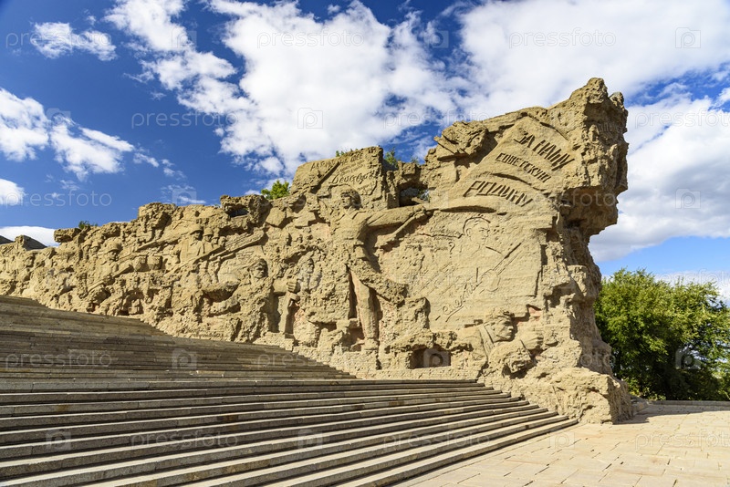 Впечатляющий памятник в Волгограде на Мамаевском кургане с историческими надписями под ярким небом