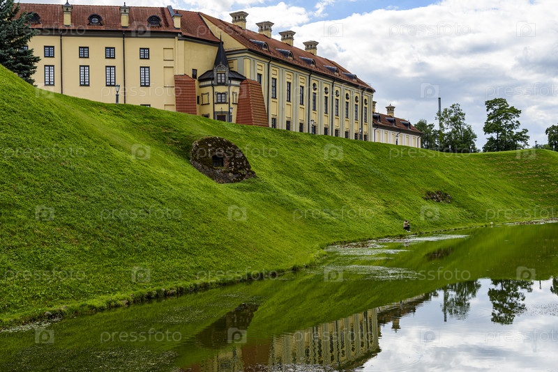 Замок Мир в Белоруссии с видом на безмятежное озеро с отражением