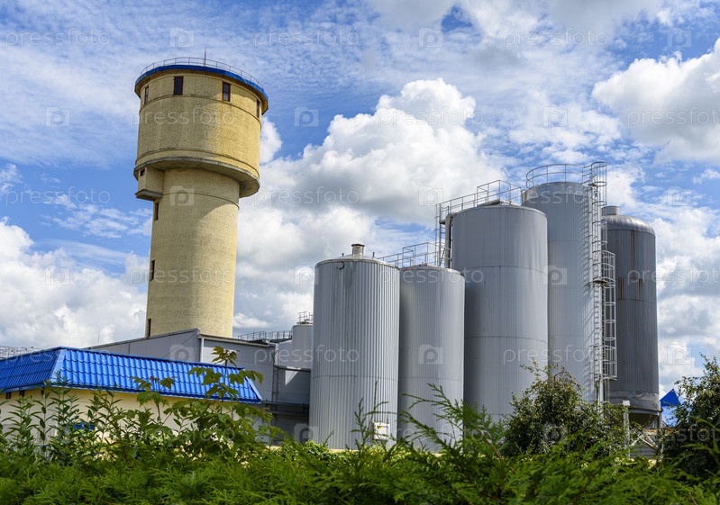 Промышленная водяная башня и вертикальные танки для производства пива против облачного неба
