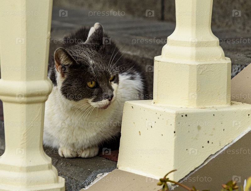 Любопытный строгий и суровый серо-белый кот отдыхает возле лестницы