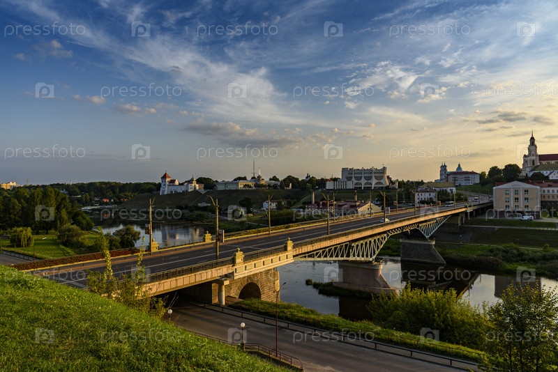 Гродно, Белоруссия, живописный вид исторического моста через реку Неман и городской пейзаж на рассвете