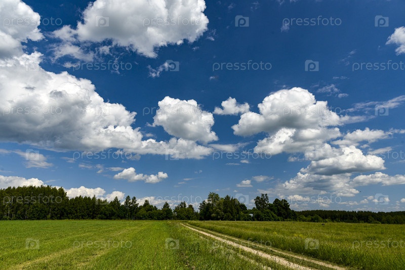 Бесконечное зеленое поле под облачным голубым небом