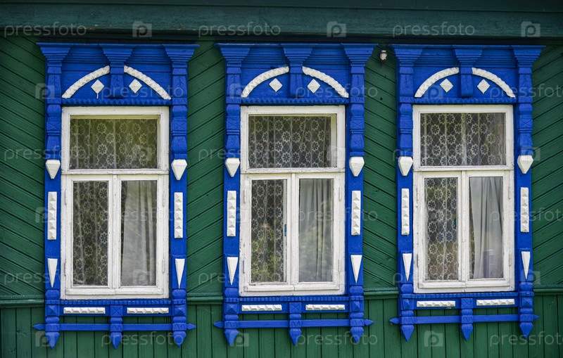 Деревянные деревенские окна с синими оболочками на зеленой стене дома