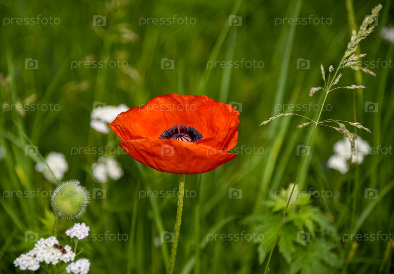 Ярко-красный мак цветет на пышном зеленом лугу