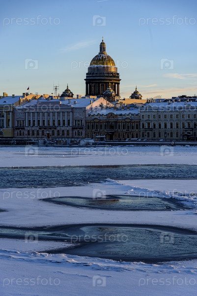 Собор святого Исаака, освещенный закатом солнца над замерзшими водами Невы