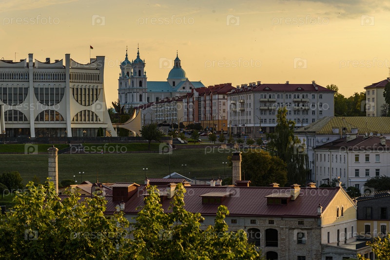 Гродно, Беларусь, исторический городской ландшафт с современной архитектурой и церковью заката