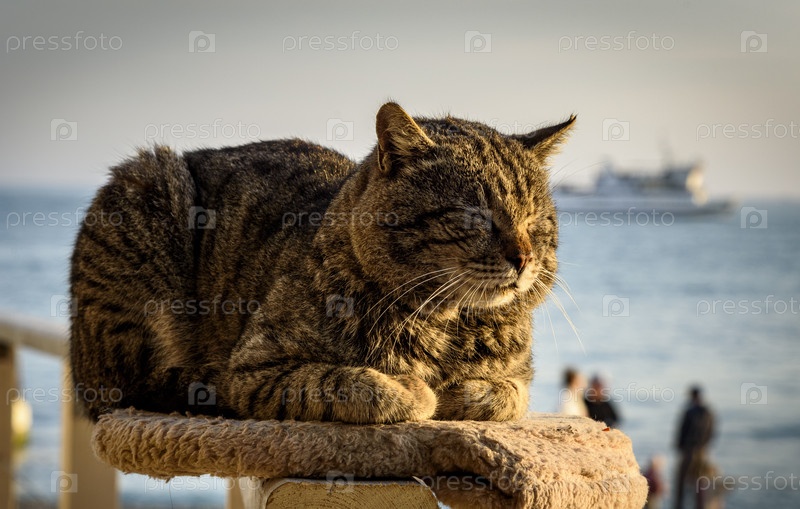 Сильная полосатая пляжная кошка отдыхает на берегу моря при закате