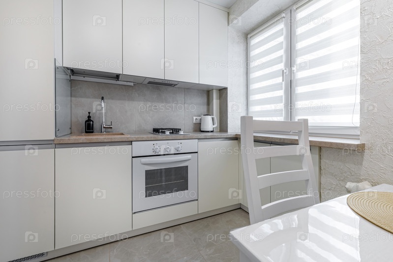 Кухня. Functional kitchen interior in a studio apartment. Features white minimalist cabinets, an oven, a gas stove, and a dining table with a chair in the foreground. Large window with zebra blinds