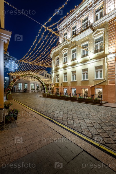 Ночная улица.Vertical shot of a cobblestone street at night featuring a historic hostel building. Strings of festive lights create a canopy over the road. The warm glow from the facade and street lamps creates an inviting atmosphere