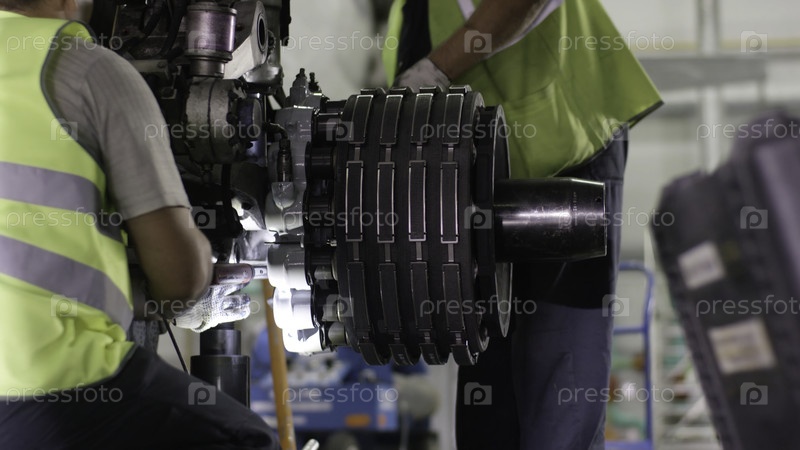 Спокойные работники контролируют двигатель и подвеску самолета. Механик по техническому обслуживанию воздушного судна осматривает шасси летательного аппарата. Установка новой подвески на самолете. Инженер проверяет шасси. Работник аэропорта, механик