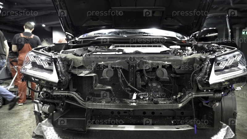 Сборка капота автомобиля на автозаводе. Действие. Близкий план деталей передней части автомобиля на фоне механиков в комбинезонах, собранных на современном автомобильном сборочном заводе