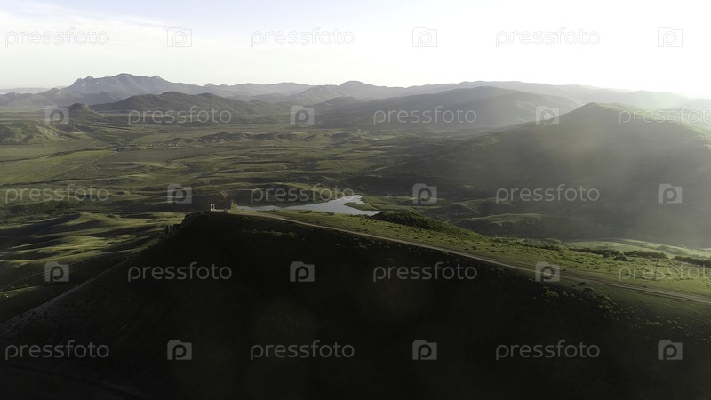 Вид с воздуха зеленых лесистых холмов и небольшого озера на облачном небе.Летите над летними горами, где растут зелёные деревья