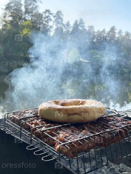Мясо и кормовый хлеб, жареные на горячих углях