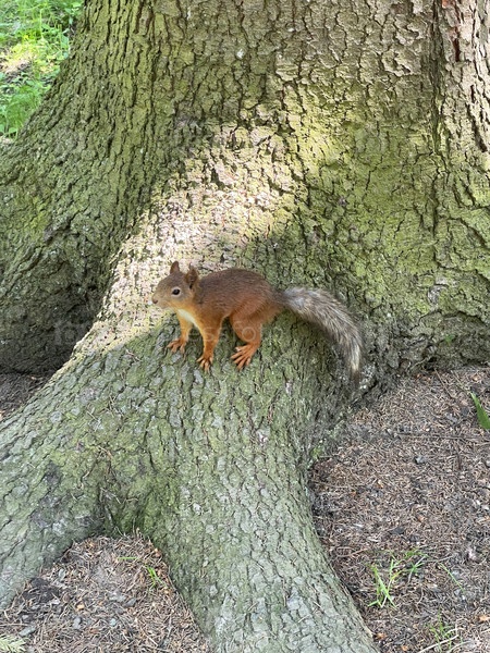 Белка в смешном положении на дереве в Петергофе, Россия