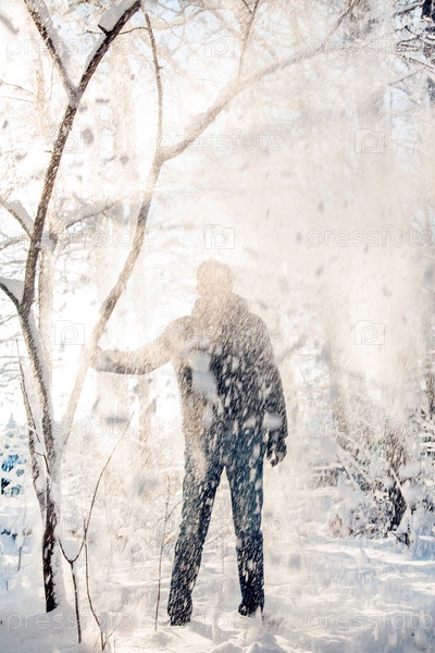 Человек потрясает дерево снегом в заснеженном лесу в солнечный день