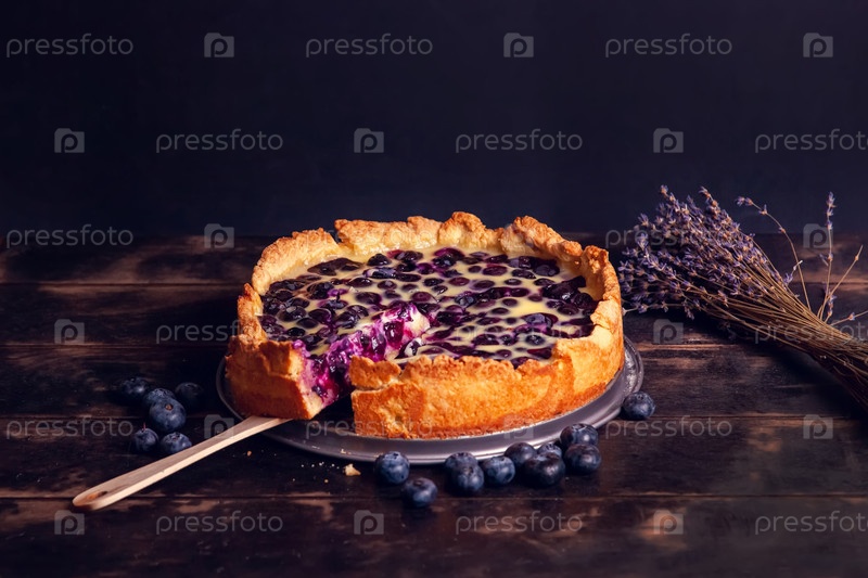 Красочный торт из короткого хлеба с чернилами в сливочной начинке на деревянном фоне и букет сушеной лаванды