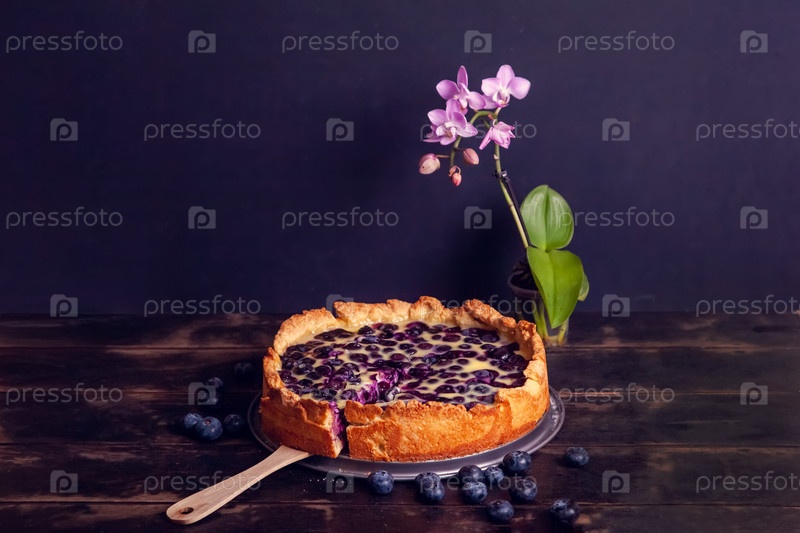 Красочный торт из короткого хлеба с ягодами в сливочной начинке на деревянном фоне и цветом фаленопсиса