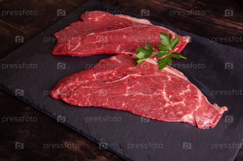 Стейк из мраморной говядины с листьями петрушки на каменном доске
