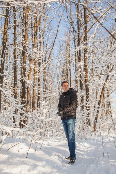 Человек регулирует перчатку в зимний сосновый лес с снегом на деревьях и полу в солнечный день
