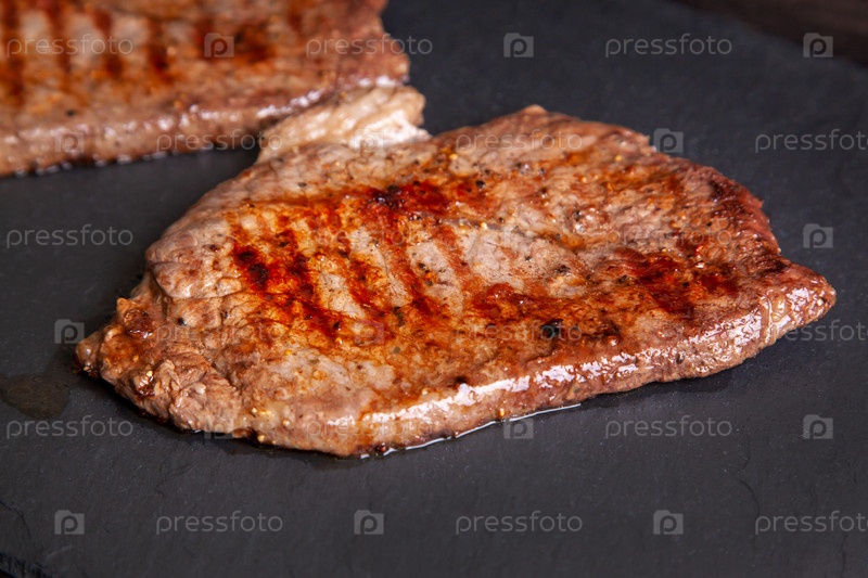 Печеный минутный стейк из мраморной говядины на каменном доске, близко