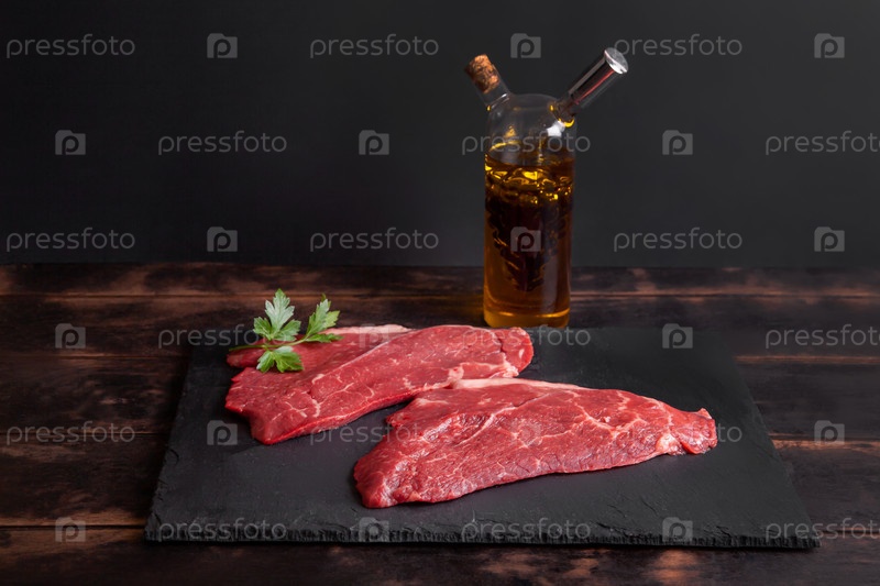 Необработанный бифштекс из мраморной говядины с листом петрушки на каменном доске, стеклянная бутылка с растительным маслом и бальзамическим уксусом