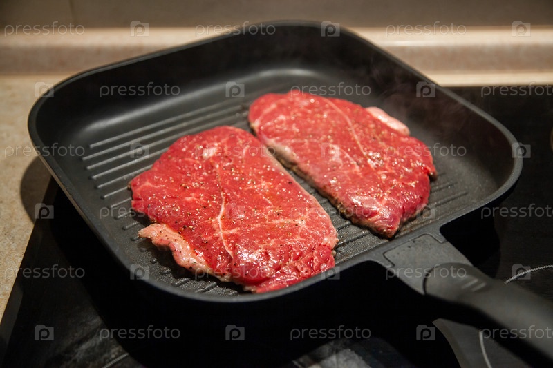 Стрейк из мраморной говядины в кастрюле на поверхности электрической кухни