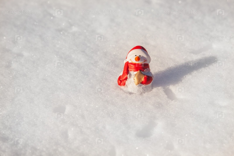 Игрушка снежного человека стоит на снежном покрытии в солнечный зимний вечер при закате.Минималистский снеговый фон со снежным человеком