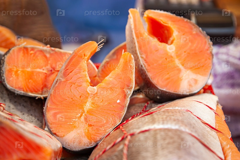 Продажа копченой камчатской рыбы. морепродукты Дальнего Востока, натуральная копченная рыба - чинукский лосось на городском рождественском рынке