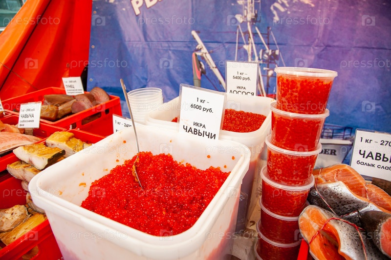 Ростов-на-Дону / Россия - 21.12.2019: Красный икры лосося - дорогой деликатес из моря на российской сельской ярмарке
