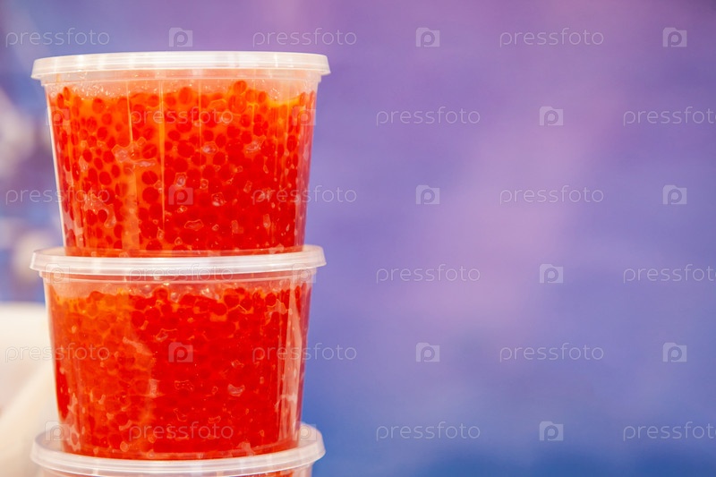 Красный икры в двух пластиковых ведрах. морепродукты. гурманские деликатесы из моря. синий фон с копией пробела