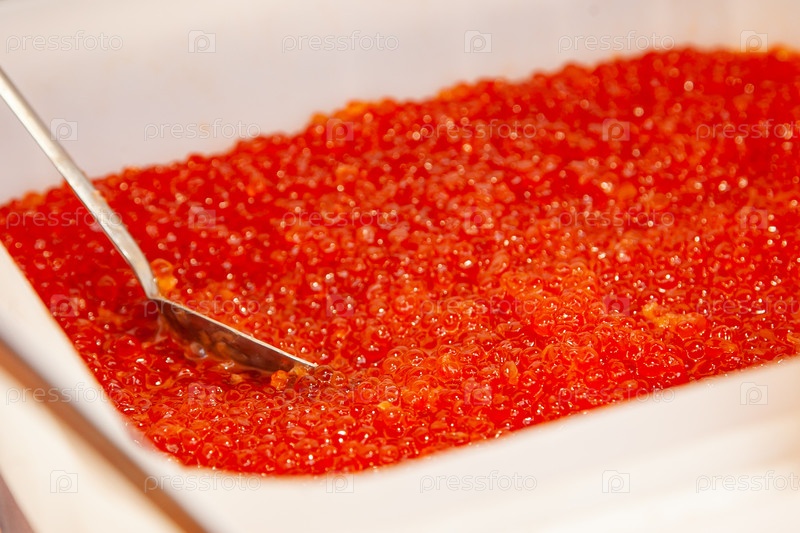 Красный икры лосося в пластиковом ведра с ложкой. морепродукты. дорогие деликатесы из моря на российской сельской ярмарке