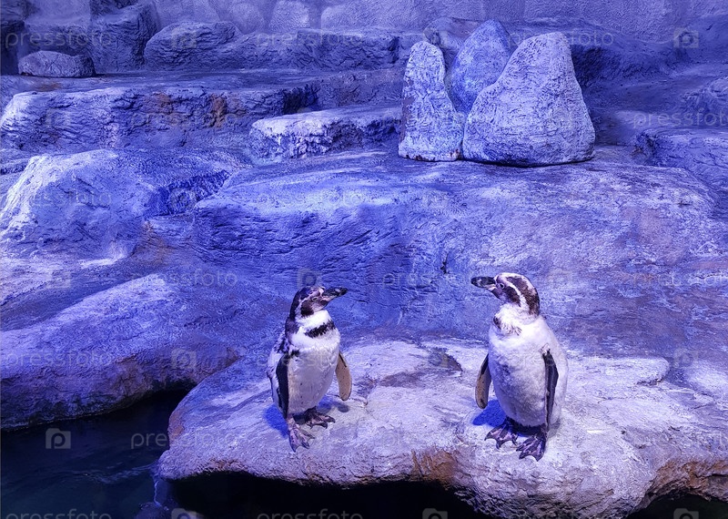 Пингвины стоят на скале в зоопарке