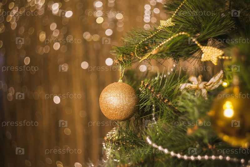 Золотые рождественские игрушки, шары, гирлянды на ветке елей на блестящем фоне с боке