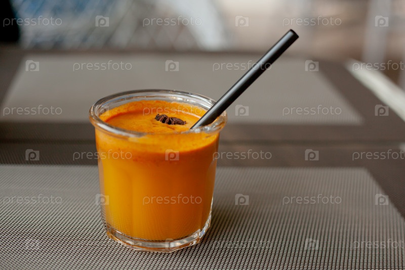 Осенний напиток в стакане с трубой и куском звездного аниса на открытой террасе