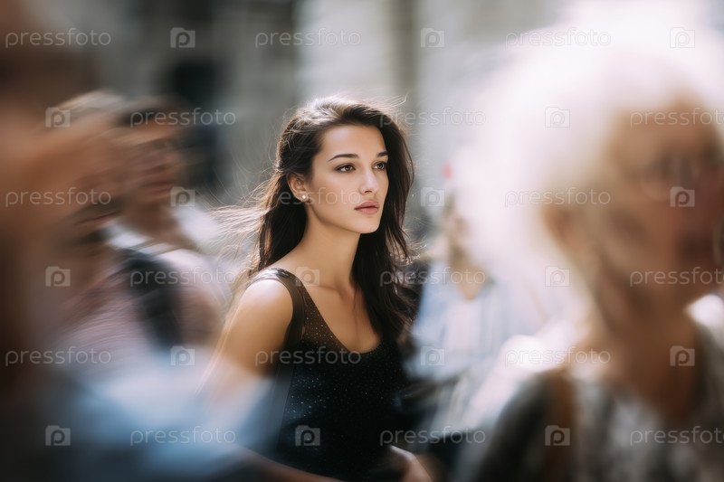 Молодая красивая девушка в черном платье среди размытой толпы
