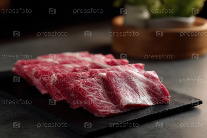 Сырая свежая говядина нарезана на черную тарелку