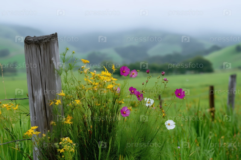 Красивые цветы и деревянный забор на лугу в горах