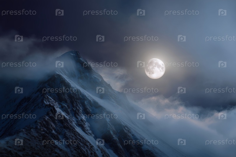 Горный пейзаж ночью в полнолуние с туманом и облаками