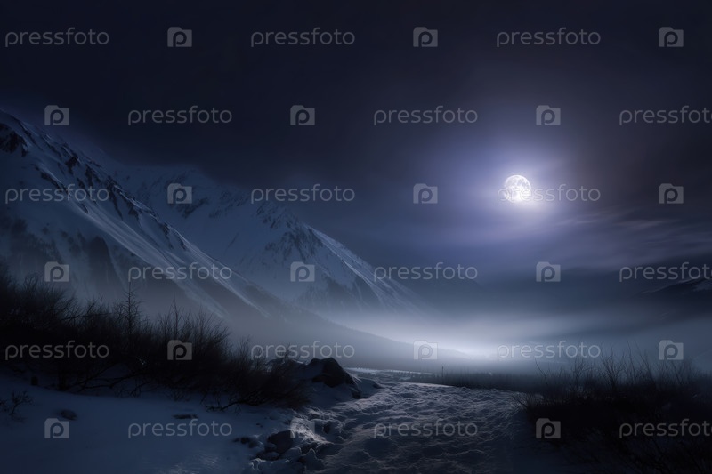 Горный пик в облаках ночью с полнолунием на небе