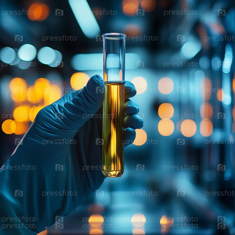 Любимая рука держит пробирку в лаборатории с теплым светом