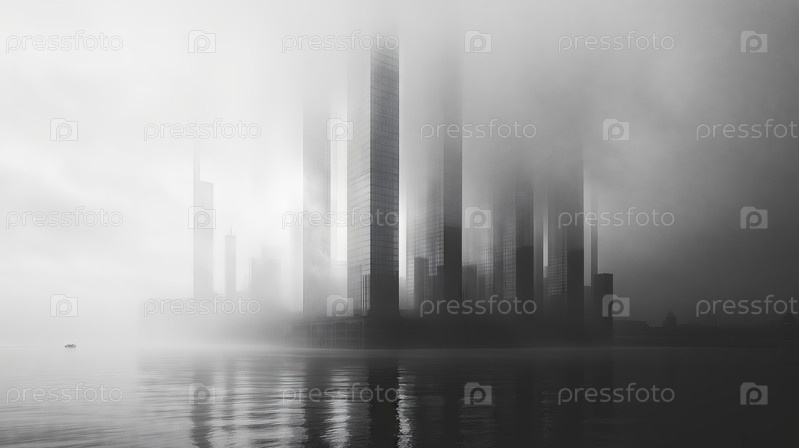 Футуристический городской горизонт, выходящий из густого тумана над водой
