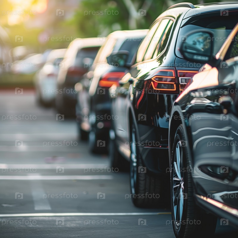 Ряд припаркованных автомобилей на открытой парковке на закате