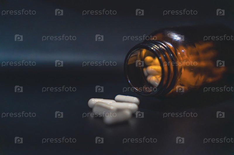 Откройте коричневую бутылку с разбросанными белыми капсулами на темном фоне