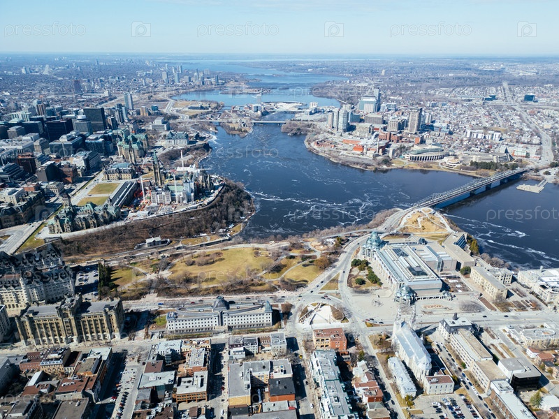 Вид из воздуха на Оттаву и Гатино с рекой, мостами и городским ландшафтом под ясным небом