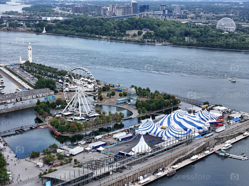 24 августа 2025 года беспилотный полет над голубо-белой палаткой в Старом порту Монреаля с городским горизонтом на заднем плане
