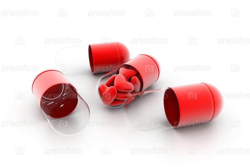 3D иллюстрация таблетки, заполненной сердцами. Концептуальный дизайн