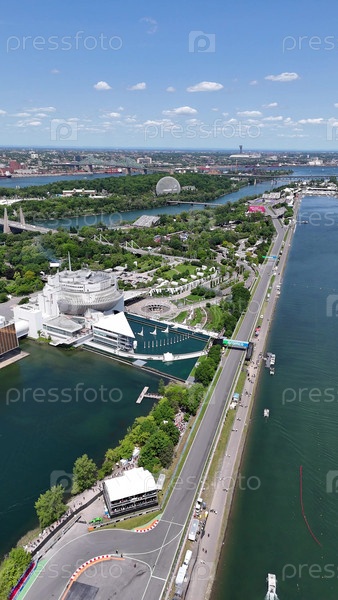 14 июня 2025 г. Полет вертолета Монреаль F1 с переполненными трибунами, водными каналами и горизонтом города