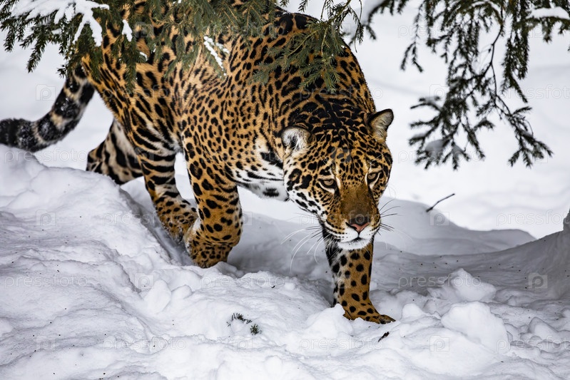 Ягуар в снеге под ветвями пихты
