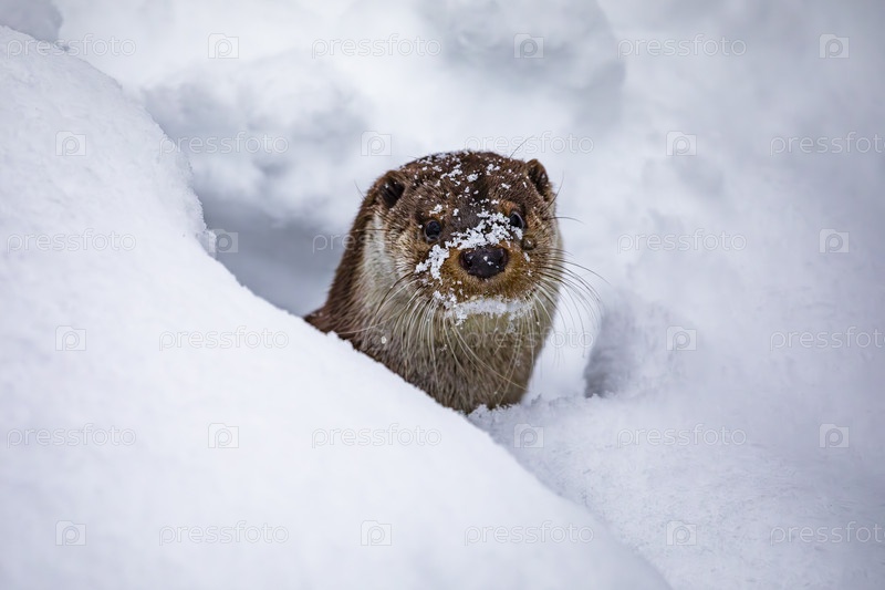 Выдра в снежном дрейфе зимой