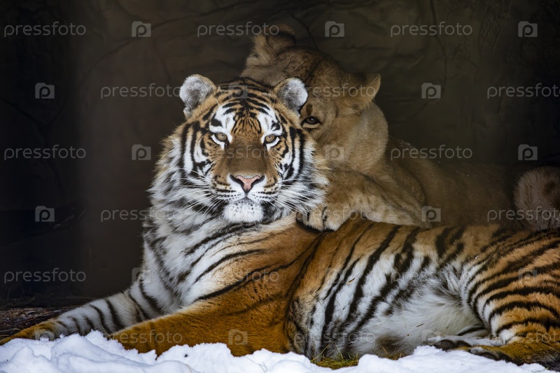 Львица и амурский тигр в снежном зимнем лесу